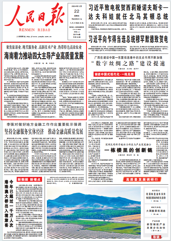 5月22日,《人民日报》头版头条刊发文章《聚焦旅游业、现代服务业、高新技术产业、热带特色高效农业海南着力推动四大主导产业高质量发展》